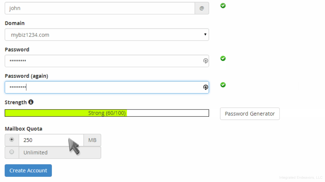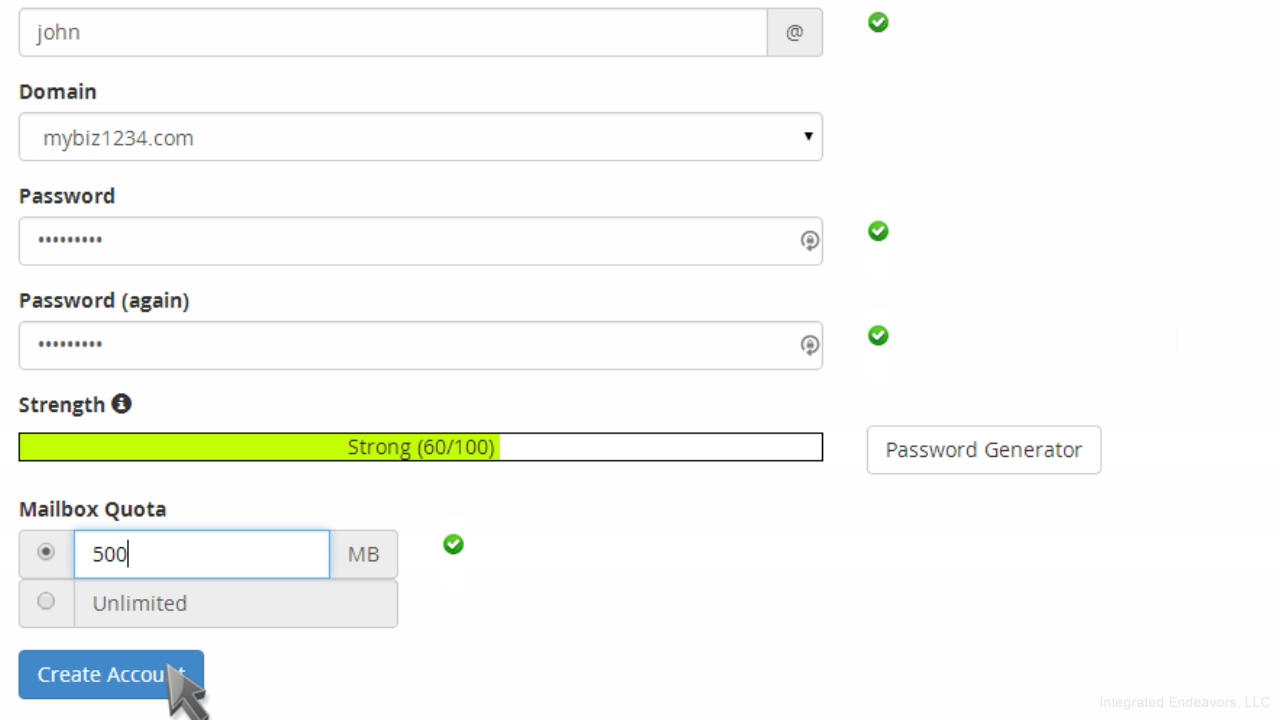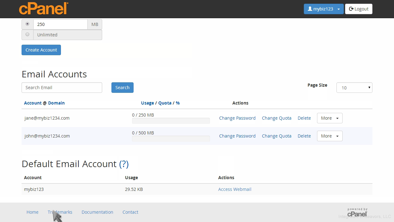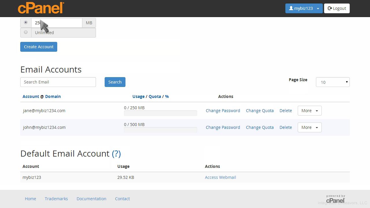 From the Email Accounts screen you can access webmail for the account, change its password, change the quota, or even delete the account.